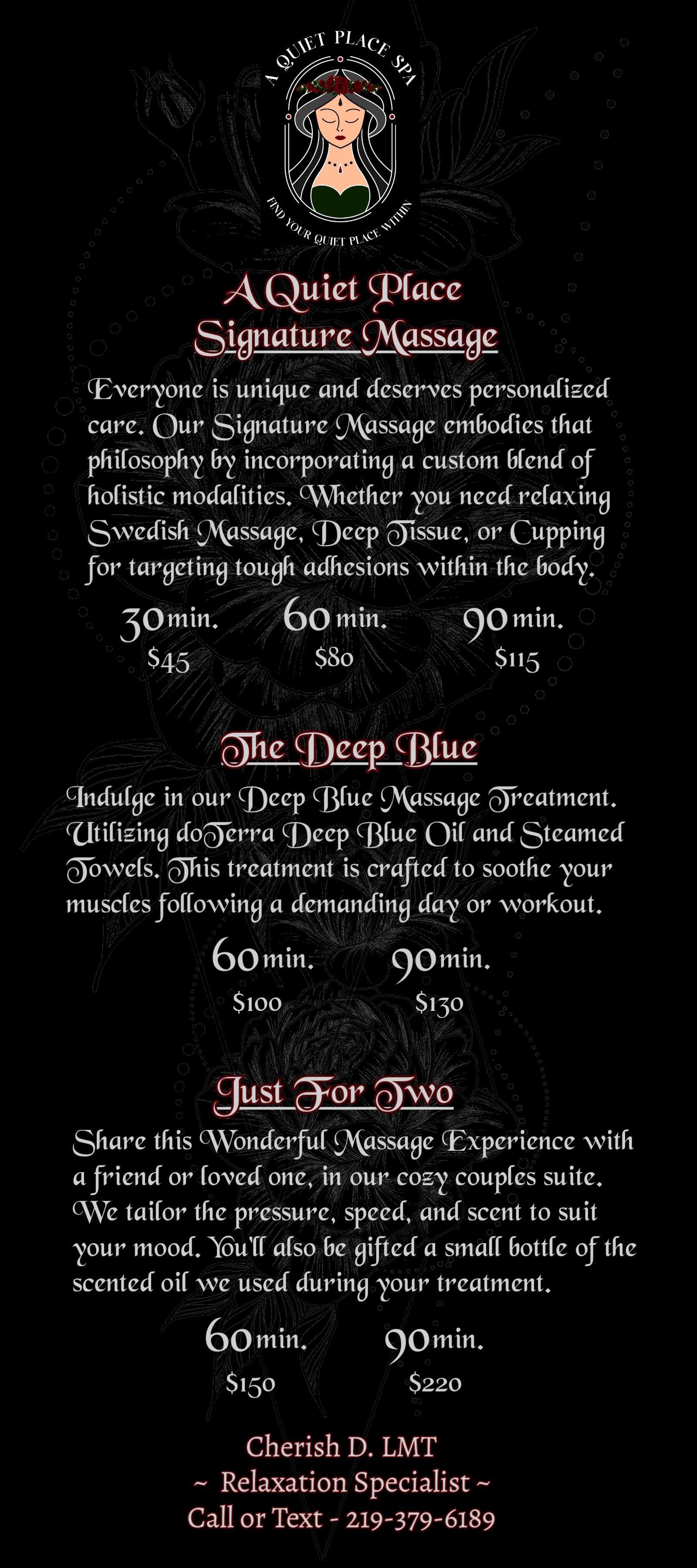 Ready to experience deep relaxation or have questions about our massage services? Reach out me anytime at A Quiet Place Spa in Michigan City, In., and allow me to guide you to your quiet place within. Fill out the form below and we’ll be in touch soon! Or feel free to call me @ 219-379-6189.